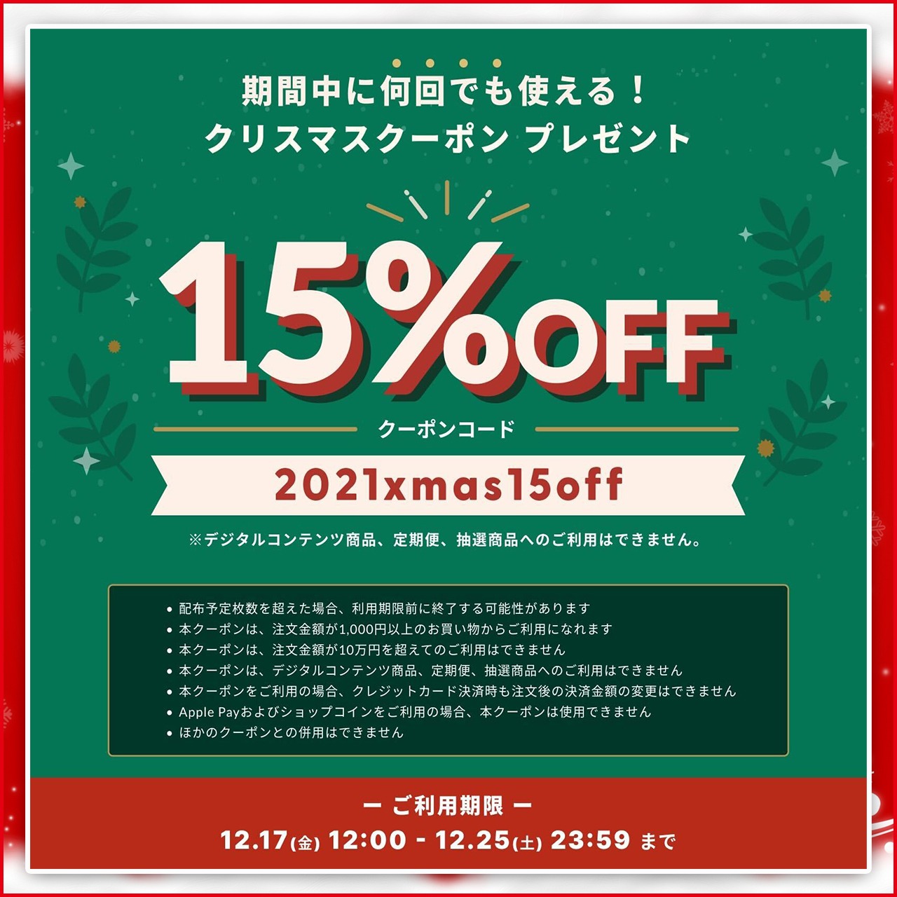 そして期間限定ですが、ネットショップとショッピングアプリの「Pay ID(旧 BASE)」両方で使え、期間中は何度でもお客様にご利用頂けるお得なクリスマスクーポンクーポンキャンペーンも開催しております。全商品対象で期間中、何度でもお客様にご利用頂ける15%OFFクーポンをプレゼントしております。詳細については下記をご確認下さい。