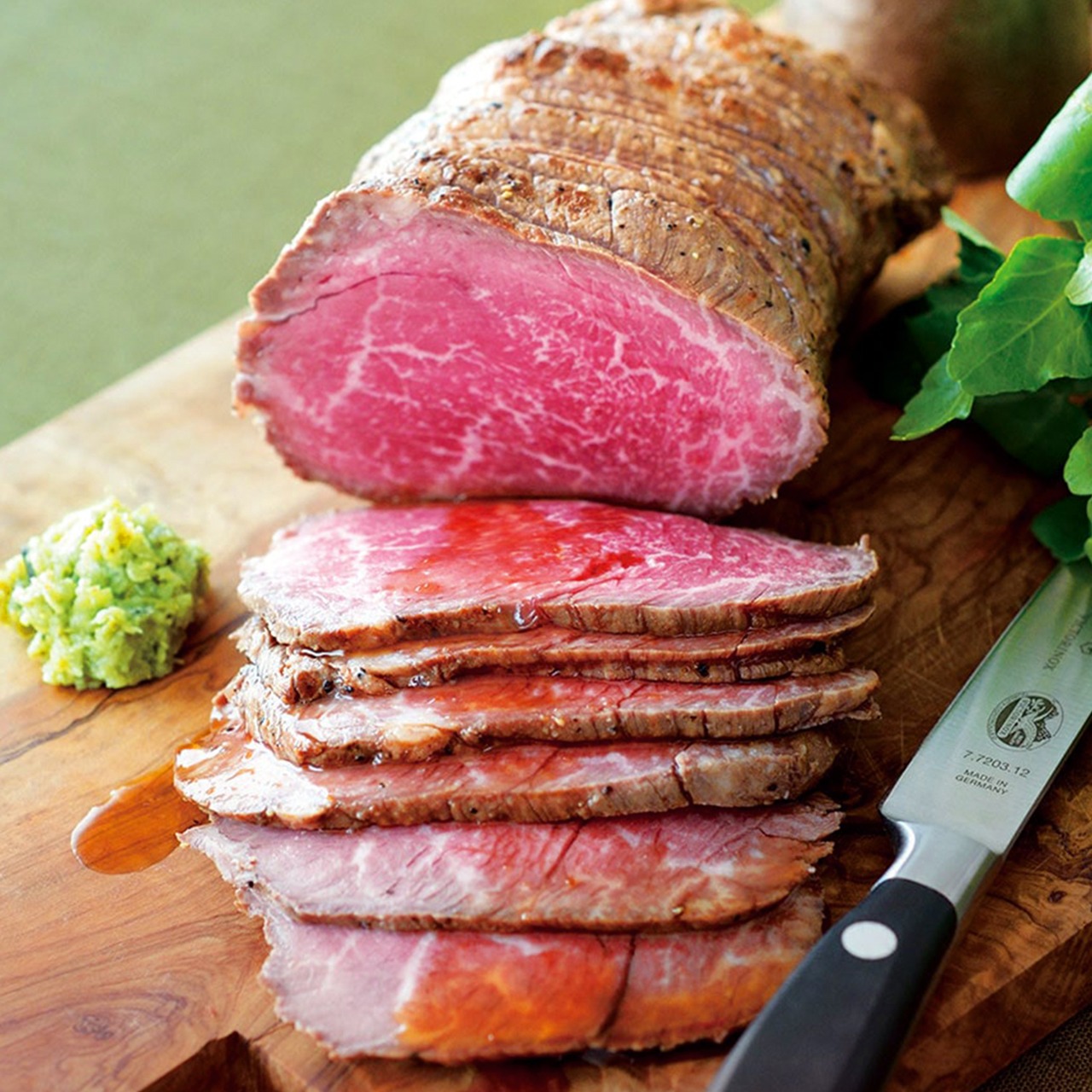 創業29年の目利きで厳選した品揃えで精肉店を営む「肉工房 千里屋」が豊かな森の恵に包まれた大地と牛に寄り添いながら営む「平松牧場」の確かな品質・旨さの和牛を使用し、お互いがこだわり抜き誕生したのが千里屋オリジナル自家製「国産黒毛和牛ローストビーフ」です。噛むごとに溢れ出す肉汁は、たっぷりジューシーで1度食べるとまた食べたくなる美味しさは至福そのものです。